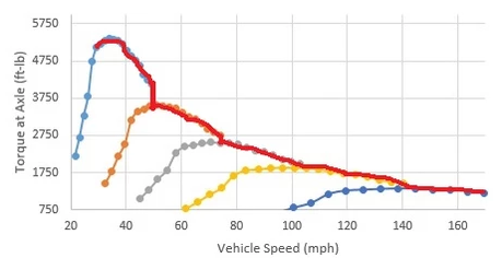 无论是0-100km/h还是0-400m加速,燃油车都非常吃亏,因为发动机扭矩输出范围很窄,所以就需要换挡,为了让每一挡扭矩输出都接近轮胎最大牵引力,发动机扭矩输特性围和变速箱齿比都要精心调校和匹配。但即便如此,燃油车还是达不到电动这样完美。