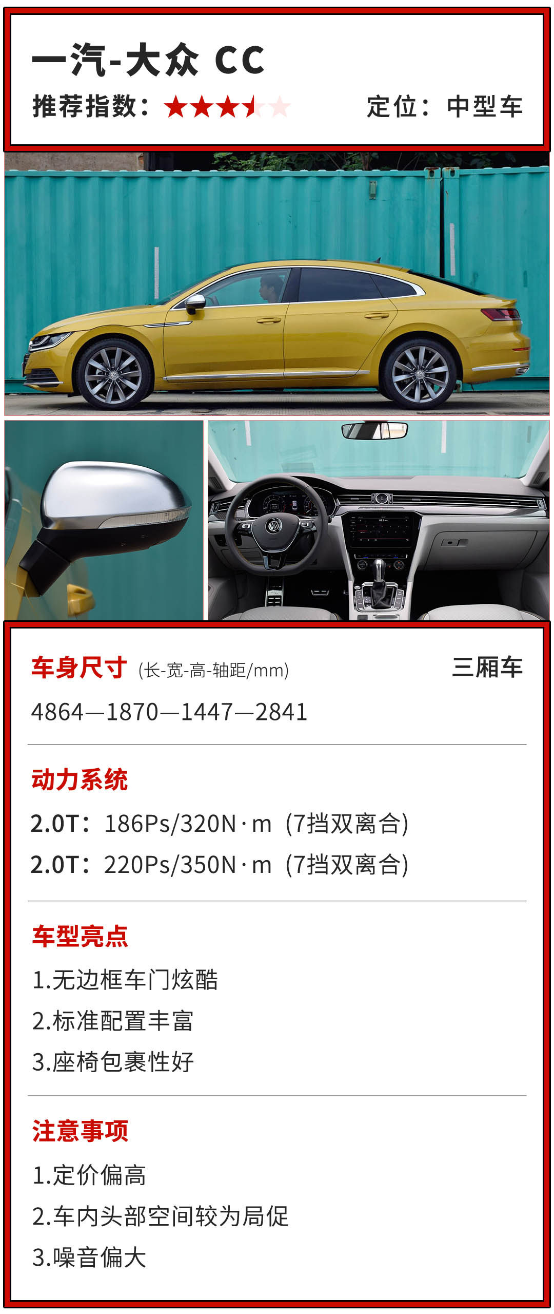 相比于外观,内饰则要显得单调许多,还是那样“大众范”。规规整整的设计风格,再加上指针式的钟表,更多显现出的是高级商务感,与其轿跑车的外观设计有些违和。再者,受限于它的车身设计,车内的头部空间较为局促,更多的体现在后排,加上无边框车门的设计,密封性受到一定的影响,高速时风噪较为明显。另外,在高低配的轮毂搭配上,低配车型的小轮毂与车身设计严重不搭,整体出来的效果相当的差,视觉观感差距较大。