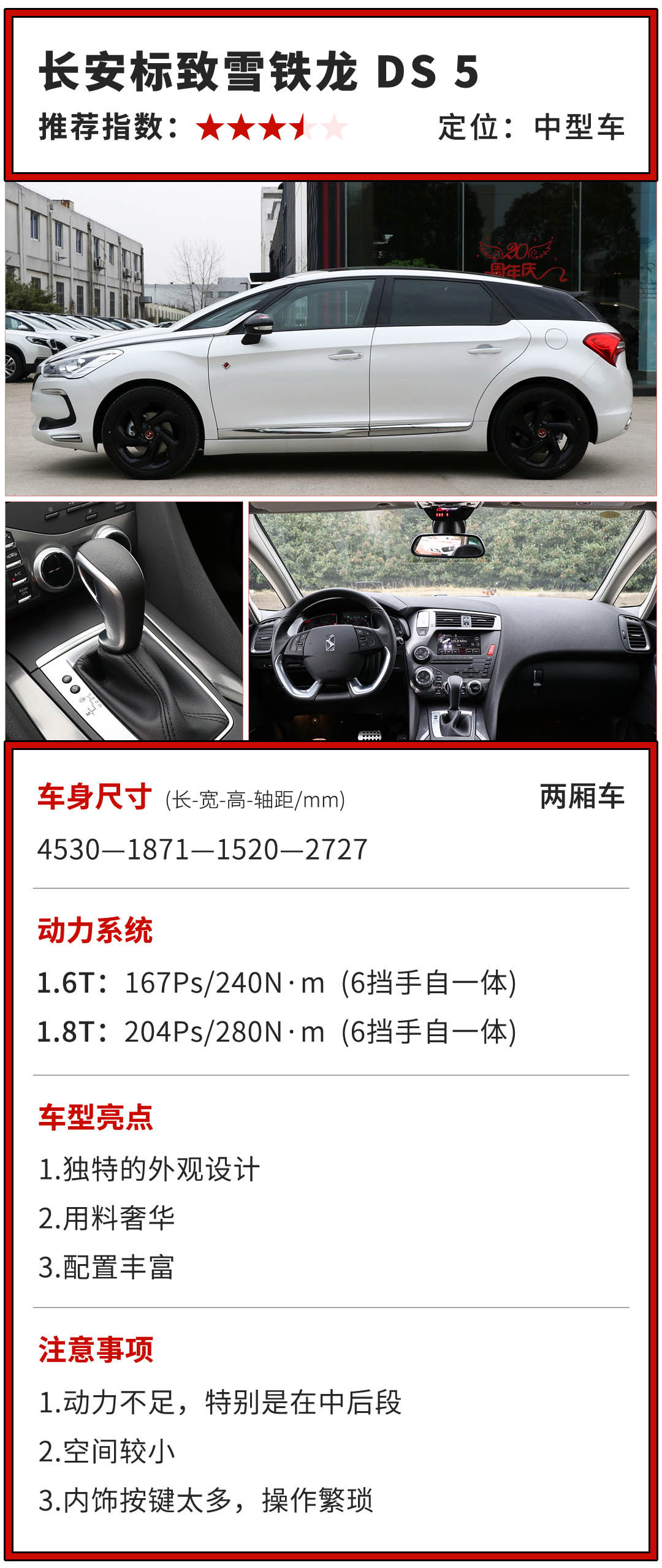 但其实,它的缺点也是挺突出的,大部分受限于它的设计。双A柱、高腰线的设计对驾驶者的视线有着不小的阻碍。另外,“飞机舱”的内饰设计,繁多的按钮,想要熟悉的操作好它,也需要一定时间适应。最主要的还是动力表现,特别是在中后段,加速度明显减弱了不少,在高速超车也相当的乏力,这个有待改进。