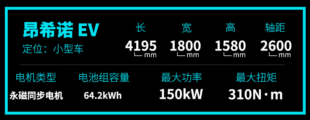 昂希诺EV采用大陆永磁同步电机,最大功率150kW,峰值扭矩为310N·m,最高设计时速为170km/h。该车的电池组来自宁德时代,容量为64.2kWh,电池组容量密度为146.6Wh/kg,可提供NEDC最大续航里程为500km。