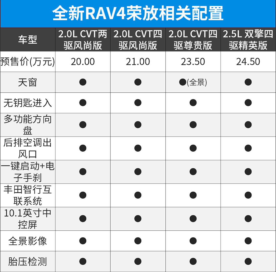 9月21日,一汽丰田新一代RAV4荣放正式开启预售,其预售价为20.00-24.50万元并将于10月正式上市。最近,4款预售车型的相关配置被曝光,本次预售包括了3款2.0L燃油版和1款2.5L双擎版车型,预售车型的配置都比较丰富,多功能方向盘、7英寸仪表盘显示屏、10.1英寸中控屏、双区自动空调、后排空调出风口、电子手刹、一键启动等均有配备,而安全配置更是十分到位,均配备了丰田智行安全TSS 2.0系统,该系统包括带行人监测的预碰撞安全系统、支持多种速度区间的自适应巡航等。