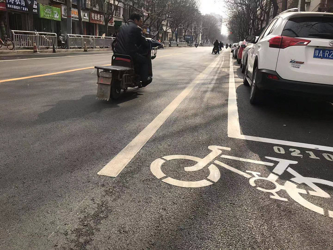 地上画着一个自行车图案的就是非机动车道,很多人把它和停车位搞混了,其实这个位置是不能停车,一停就是三分+200块。