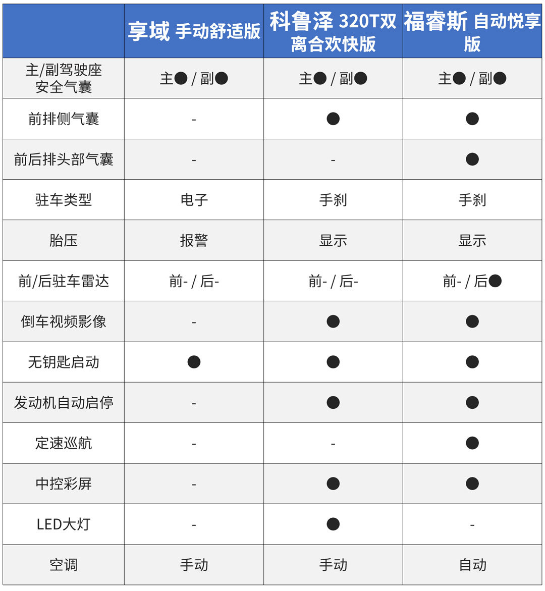 教授挑了市面上几款主流车型,看一下它们都有什么配置。享域是凌派的姐妹车型,且推出时间比凌派晚,东本充分研究了市场需求才会推出相应配置的车型。而科鲁泽就是英朗的实惠版,与英朗拥有同样的底子,价格却比英朗低一些。福睿斯则是价格和配置都合适,但销量却不如意的车型,但也具有代表意义。