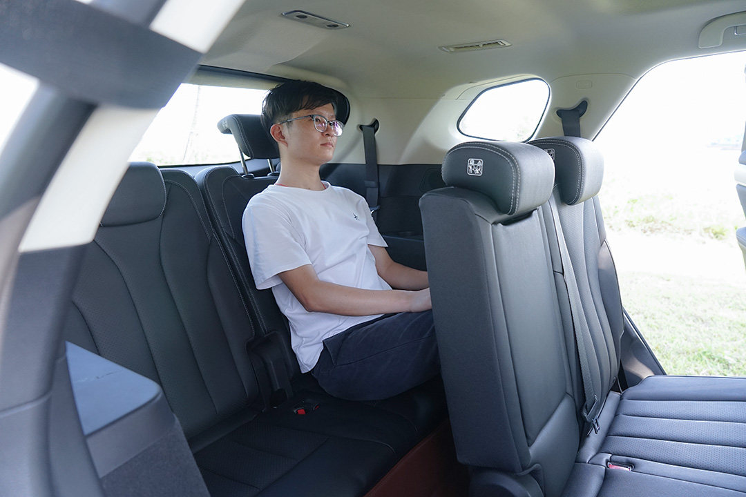 比亚迪把国人对空间的需求心理摸得很透,唐的乘坐空间在教授看来很适合“大空间”家庭的需求。前排座椅高低可调节,教授的头部接近有2拳距离,第二排头部也有1拳3指距离,如果不考虑第三排座椅,第二排可以翘起二郎腿了。如果第三排要坐人,第二排的腿部空间就没那么宽裕,换来第三排教授这个中等身材的人(172cm)合适的坐姿。
