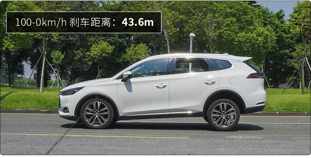 刹车点头姿态比较明显,由百到零刹车成绩最终为43.6m,这个成绩处于合格的范围内,而且为了保证仪器能记录到数据,实际上速度是到了接近110km/h才进行刹车的,会有一点小误差。