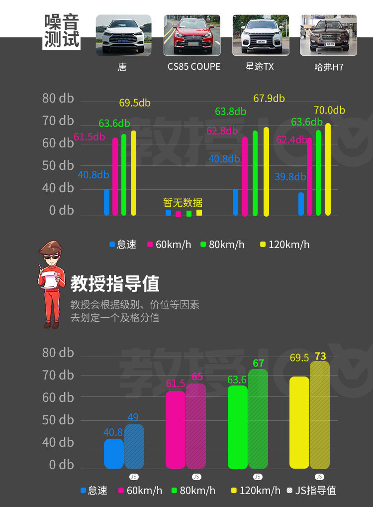 这几款车的NVH都不错,不过唐在低速(60km/h以下)时的噪音表现较好,基本上听不到胎噪和发动机的噪音,国产车在舒适性的营造上还是比较到位的。