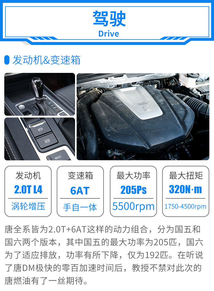 虽然零百加速成绩不理想,但是当你在高速时,唐还是能给你畅快的加速感。这就是2.0T的优势了,动力储备充足,后半段速度提升有保障。当速度突破100km/h之后,再深踩油门,动力的响应依旧迅速,你甚至不用切换到运动模式。