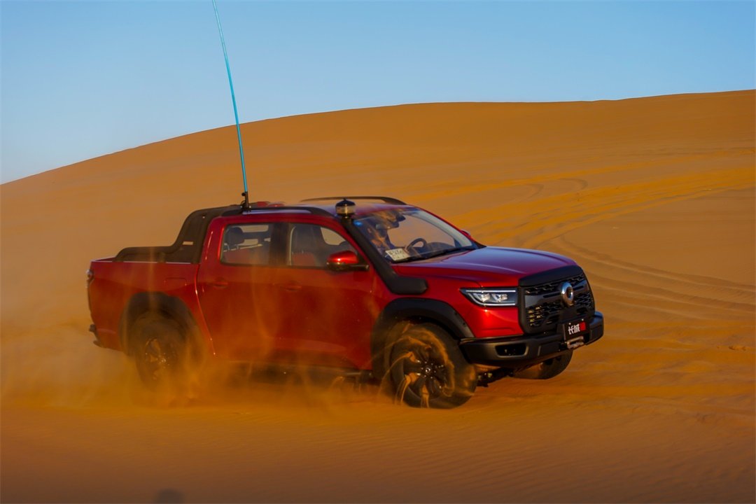 在穿沙过程中,一般的小沙丘根本不用减速就能通过,更不需要去打开什么低速四驱;遇到一些较大的沙丘只需要低速通过就行,也不需要太多的操作,这主要还是得益于长城炮的四驱系统;如果遇到陷车或者托底,通过轮胎的锁止也能很好的通过,当然如果实在无法脱困也可以叫队友帮忙,玩越野的不就追求互帮互助吗?