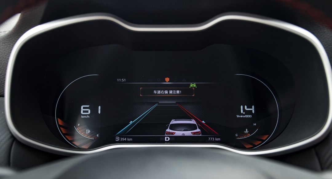 在液晶仪表上两端车道显示为蓝色时,车辆的智能主动驾驶辅助系统正常运行,在车道信息清晰的情况下,车辆会自动控制油门、刹车和转向,保持在60km/h的时速行驶。而当车辆前方出现急弯或是车道信息不明显的情况,车辆则会提示驾驶员接管驾驶。