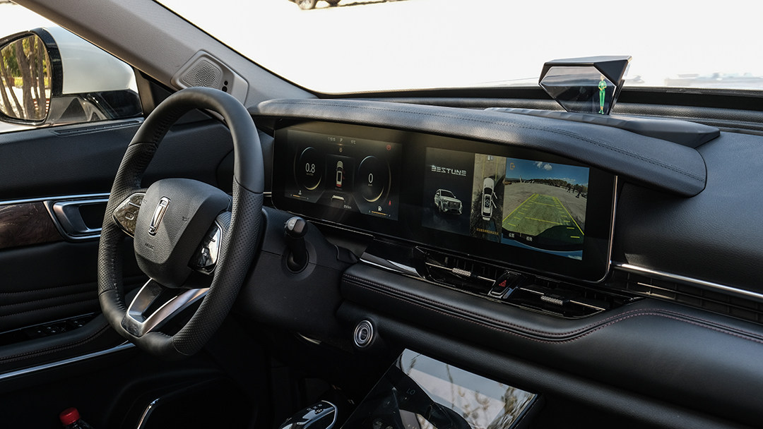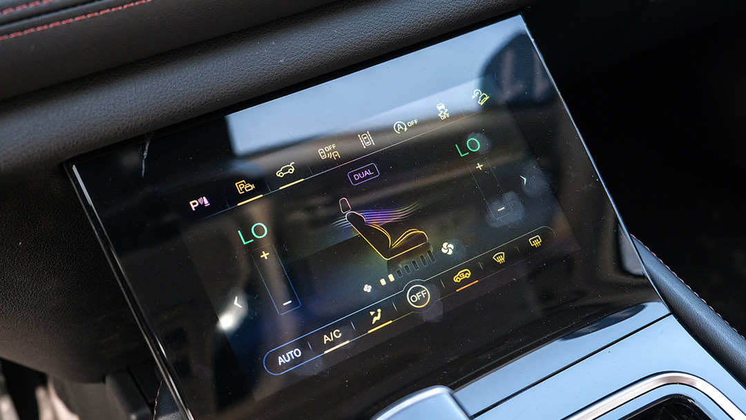 旗舰的气派延伸至车内,【科技】二字在T99身上发挥的淋漓尽致,首先映入眼帘的是双12.3英寸的液晶仪表盘&中控屏,再往下看,你会发现已经找不到任何实体按键,空调控制、座椅加热/通风、以及大部分的驾驶辅助功能都集成在第三块液晶屏中,跟新世代的奥迪有异曲同工之妙,但触控的集成化程度要比奥迪高。