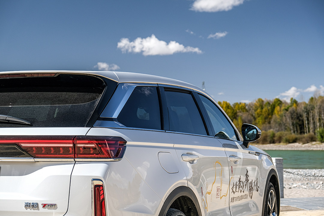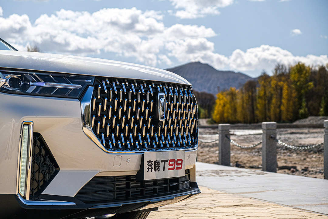 然而在视觉效果上,那是相当魁梧,只需一眼就能感受到奔腾T99的旗舰气场,前脸的T家族脸谱“数码雨滴”格栅,霸气程度丝毫不输奔驰的满天星,前后共四把“光剑”日行灯/雾灯,相当有气势,配合全身方正硬朗的轮廓,整个车身看起来就很庞大,确实是一款中大型SUV应有的气场。