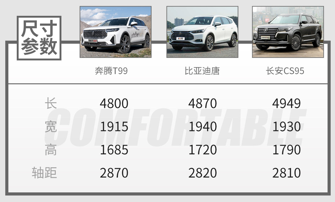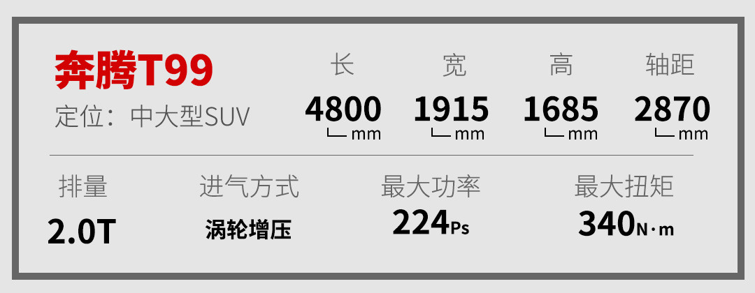 官方把奔腾T99定位为大五座的中大型SUV,不去做7座SUV是个明智的做法,但是话说回来,作为中大型SUV,奔腾T99的身材算不上“魁梧”,长宽高分别为4800*1915*1685mm,轴距为2870mm,正常来说中大型SUV要么接近5米要么都4.9米了,就连比亚迪唐都是4.87米,所以奔腾T99的三维其实不算庞大,但是既然是大五座,这都无所谓了。