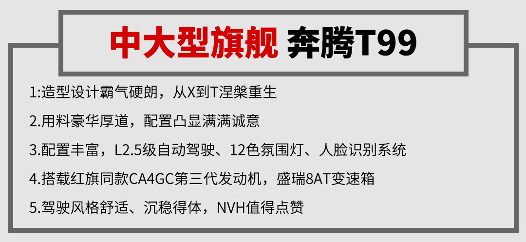 一汽奔腾,在众多自主品牌阵营当中,不算是比较突出的一批,但奔腾并没有落后步伐,全新车标一改品牌形象,走年轻化、科技化路线,旗下的T系列产品就是最直接体现,而随着这两年自主品牌的向上、高端化发展,奔腾也推出了自家的旗舰产品——奔腾T99,希望在年轻的消费市场中,获得更多的份额。