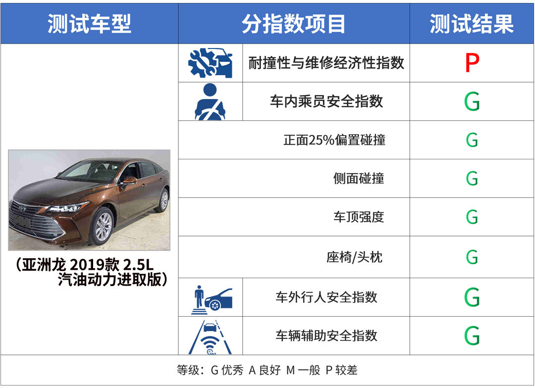 话不多说,一起来看一下相同车型之间这两大机构测试结果有何差异?丰田亚洲龙作为一款重磅车型,两大机构都对其有测试,其中C-IASI得出一个P(较差)、3个G(优秀)成绩,亚洲龙低速碰撞得了P(7分),说明其耐撞性和维修经济性较差,也就是修车贵。但是它对乘客及行人的保护是优秀的,车内成员安全指数包括正面25%偏置碰撞、侧面碰撞、车顶强度、座椅/头枕的测试,都是G等级。