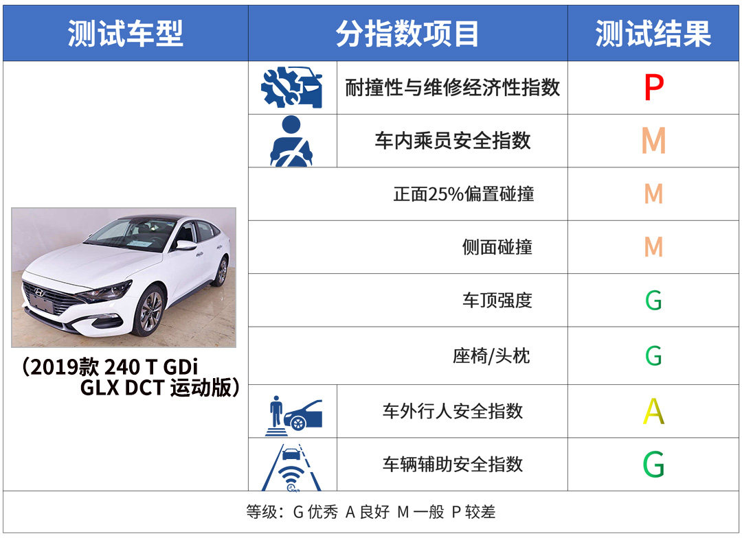 因为这个版本并没有配备AWB,所以有单独拿2019款 280 T GDi TOP DCT 智尊版进行车辆辅助安全指数的测试,最终得到了G这个成绩。