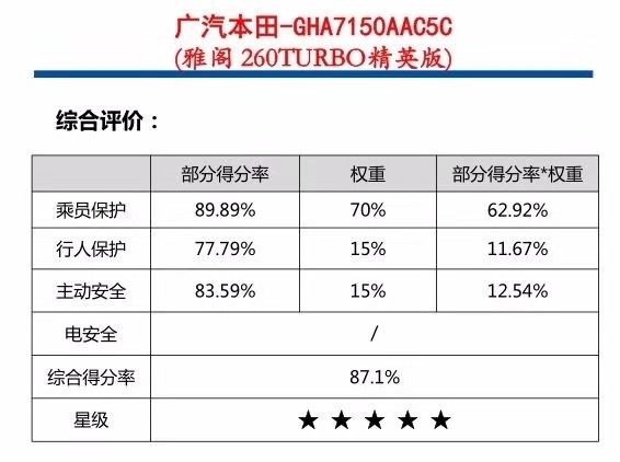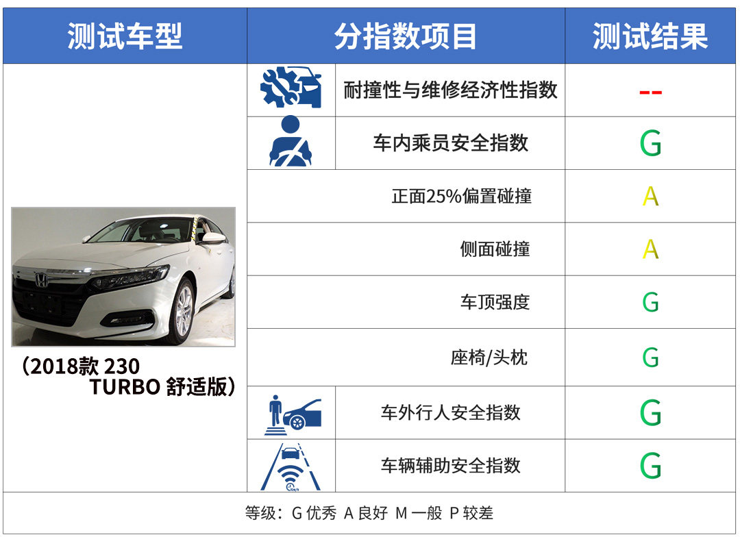 最后一辆车为雅阁,雅阁在各大机构内的成绩都不错,C-NCAP经过测试也给了雅阁5星评价。C-IASI选取的测试车辆为雅阁230舒适版,虽然三大项都为G,不过在车内乘员安全指数的细分项正面碰撞和侧面碰撞上都为A。