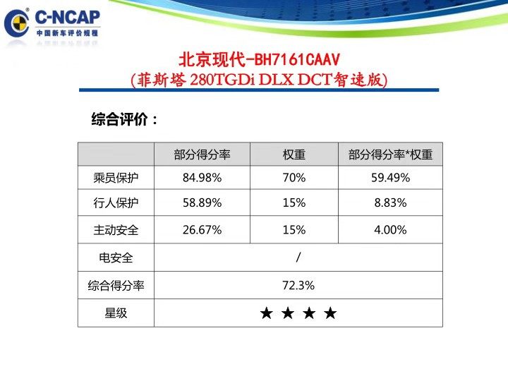 C-IASI的测试车辆为2019款 240 T GDi GLX DCT 运动版,耐撞性与维修经济指数得到了P(5.17分),车内成员指数为M(其中正面偏置碰撞和侧面碰撞为M,车顶强度和座椅头枕为G),车外行人保护为A,总体上菲斯塔的碰撞成绩并不理想。