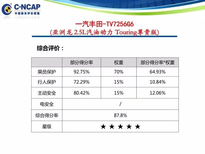 亚洲龙在C-NCAP获得了5星评价,87.8%的得分率在这些多送检车中属于比较高的了,其中正面100%碰撞试验中得分率在95%以上,侧面碰撞试验满分,这个成绩要高于C-IASI的结果。(注:两车虽然不是同一车型,不过在车身结构、安全配置上是一样的)