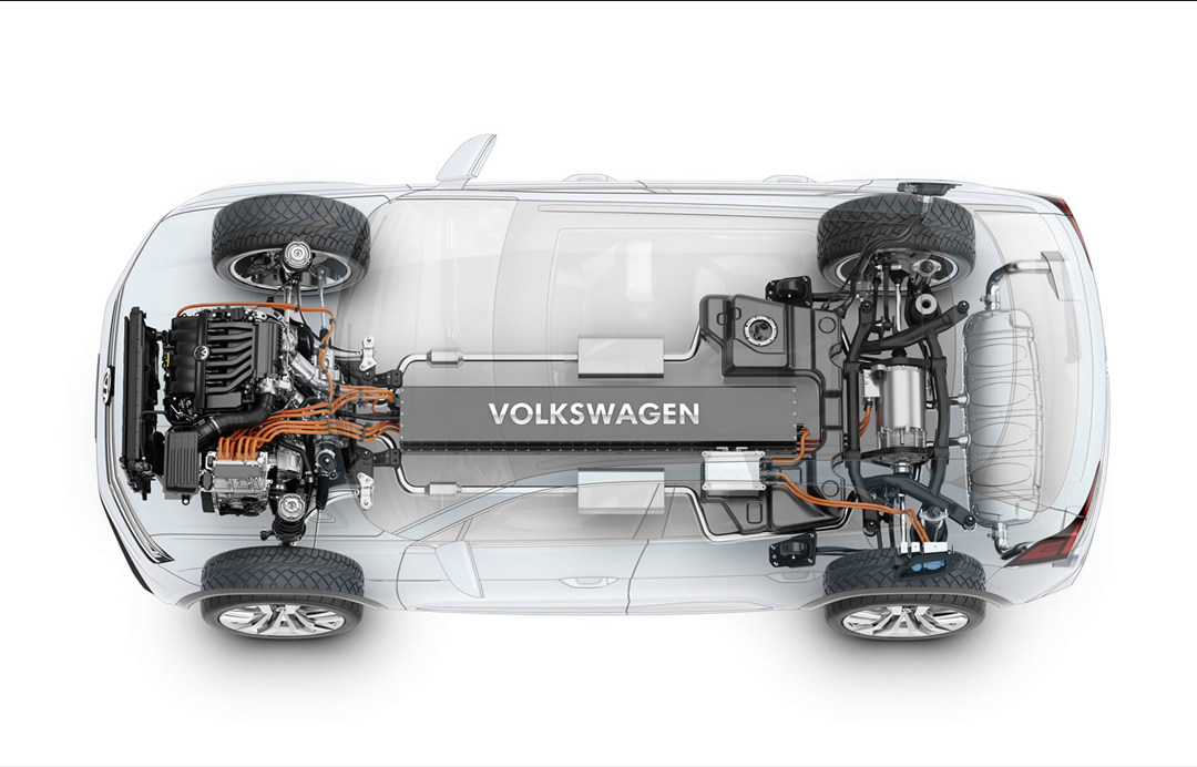 大众的插电混动系统就没有两田那么复杂,简单来说就是在P2位置(变速箱前,离合器后)增加一个电机,再通过电池为电机提供电能,驱动车辆。电池容量12.1kWh,工信部纯电续航里程63km。