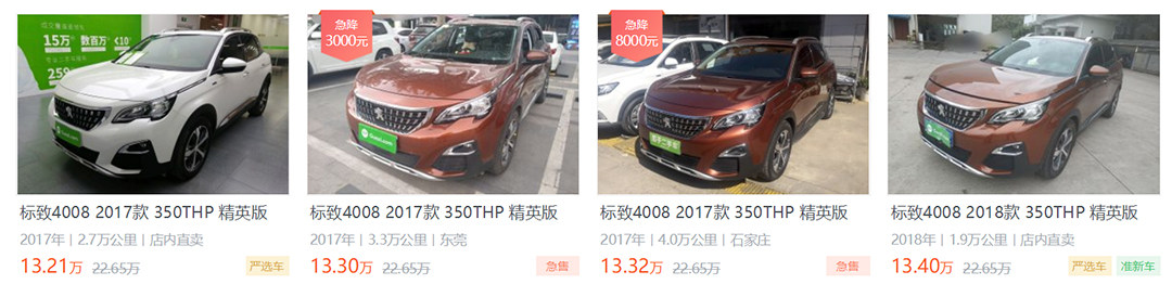 以4008为例,根据2019年9月乘联会公布的汽车平均保值率,3年车龄紧凑型SUV平均保值率为61.6%,在某大型二手车网站上,有很多2年左右5万公里内的4008已经低于这个价格。从中还是能说明一些问题。