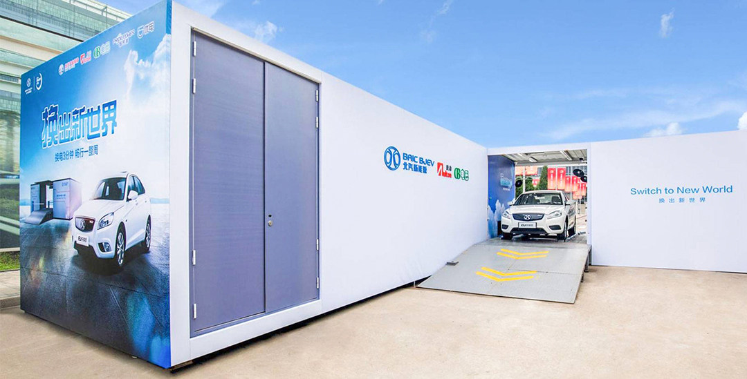 北汽新能源换电站建设非常简单,利用几个集装箱进行系统模块化设计即可以达到目的。至于为什么选择集装箱,主要因为集装箱方便建造,而且可有效降低成本。