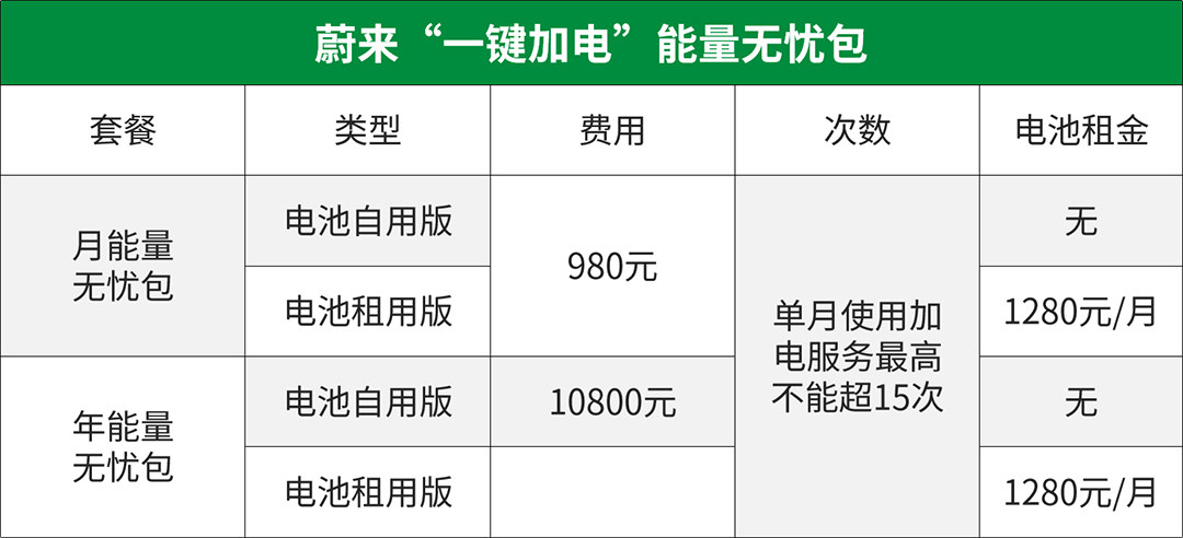 换电模式虽然好,但花费也并不便宜,以蔚来“”一键加电”服务为例,蔚来车主可自由选择月费980元和年费10800元两种“能量无忧包”套餐中的一种或是采用非套餐加电服务。购买“能量无忧包”后,车主每月可享受15次一键加电服务(无法累积),一年180次,平均每次换电费用60元。