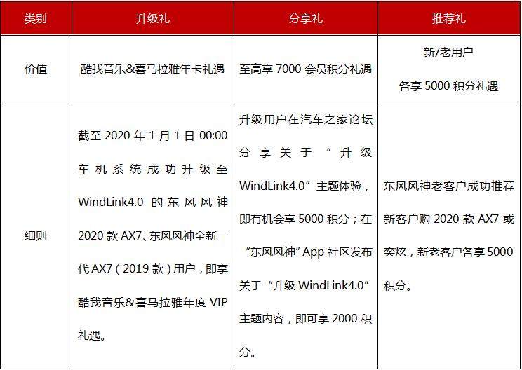 本次东风风神2020款AX7、东风风神全新一代AX7(2019款)车机系统的升级,不单单是软件的优化和性能的提升,更开启行业先河,联合酷我、喜马拉雅为车主定制独家车载VIP会员专属权益,并赠送一年免费VIP会员使用,同时,还增加组队和路书功能、品牌专区导航功能和个性化设置主题壁纸,五大升级,将使功能强大的WindLink4.0人工智能车机系统更为科技、酷炫。