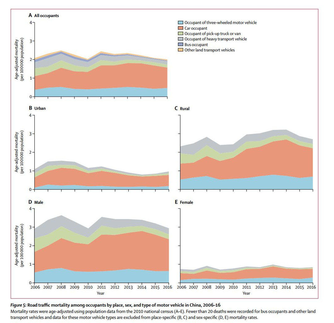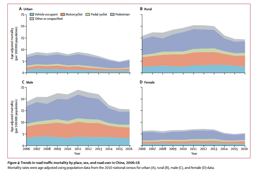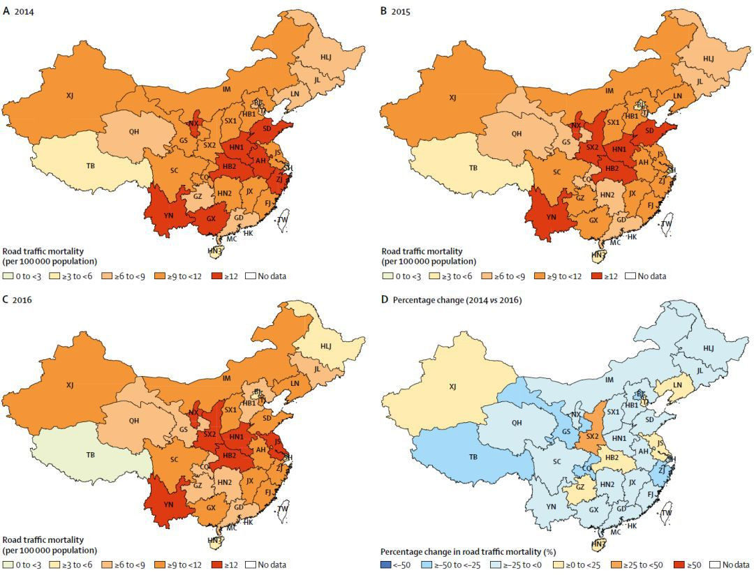 近期,柳叶刀公共卫生杂志根据国家疾病监测点获取到的数据,发布了一份关于我国交通事故死亡率的研究报告。该报告分别统计,在2006-2016年这十年间,因交通事故而丧生的总人数、各省交通事故的死亡率以及农村与城市、不同交通方式之间的死亡率差异。
