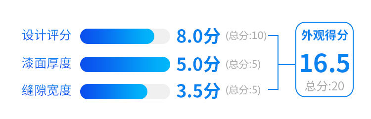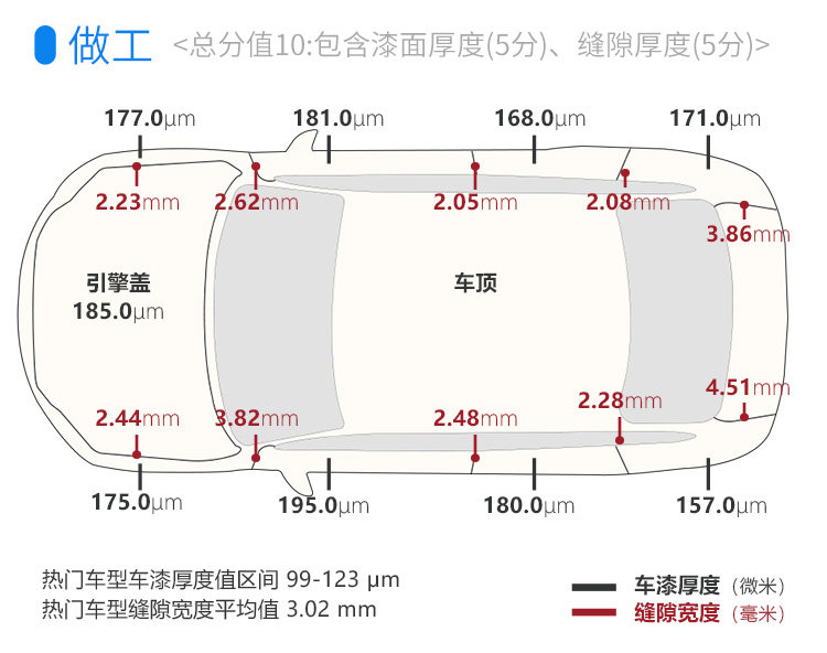 美系车的漆面厚度还是一如既往肯下料,昂科拉GX的平均漆面厚度为175,在这么多紧凑型SUV中可以排在前列。车身间隙比较均匀,大都集中在2-3mm之间,做工不错。