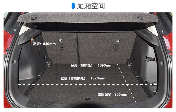 后备厢常规深度900mm,轮拱处凸起不明显,载物能力可以预见,行李箱这些大物件基本没问题。想要更大的空间可以把后排座椅放倒,以得到1730mm进深,可惜座椅不能全平放倒。