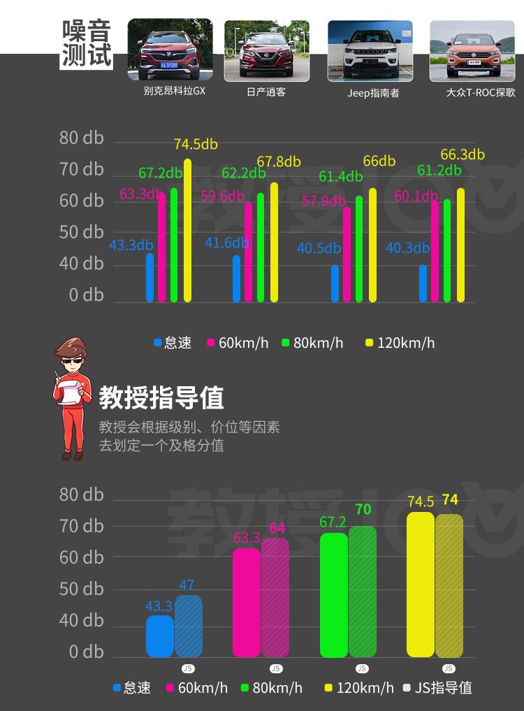 后复合扭力梁式非独立悬架的好处在于让后排中央过道位置没有隆起,后排第三人也能得到舒适的乘坐体验。对比同为扭力梁的XR-V,昂科拉GX在底盘的质感上明显高一个等级,扭力梁也并非大家想得这么差,在教授看来GX在中低速时悬架的滤振效果干脆。只要不突破它的极限,日常代步还是挺合适的,结合各速度区间的噪音分贝值也可以发现,100km/h以下,昂科拉GX的噪音值都比较出色,但是速度达到120km/h之后,发动机的轰鸣声加重,这是众多小排量发动机无法避免的。再加上风噪、胎噪各种噪音随速度的增大而增大,噪音值的表现就一般了。