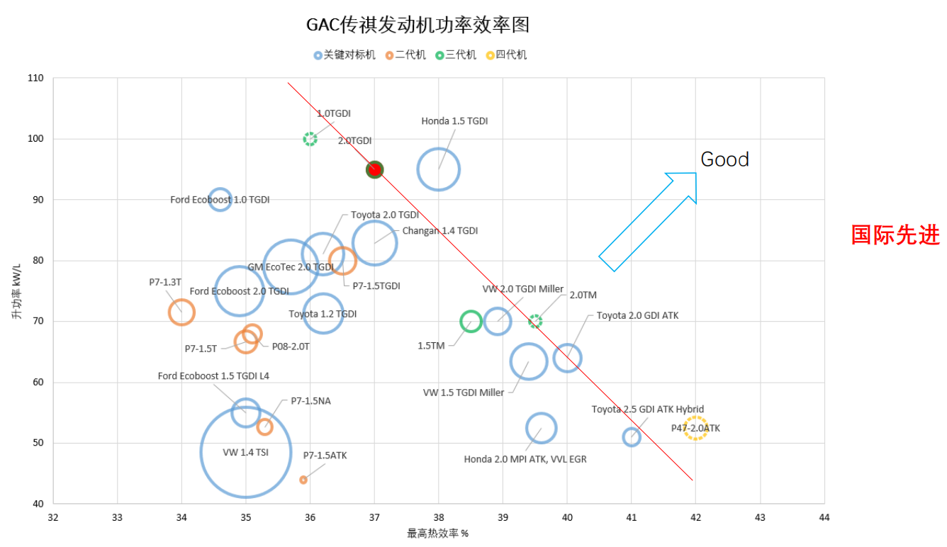 广汽研究院发动机总工程师给出一张发动机功率效率(热效率)图,图中涵盖了多款明星发动机,比如大众EA888系列、本田L15B、丰田最新的M系列。工程师将目前功率与效率之比最高的发动机用一根红线连接,处于红线上的发动机就是目前领先水准,GS8的第三代2.0T就在这条线上。