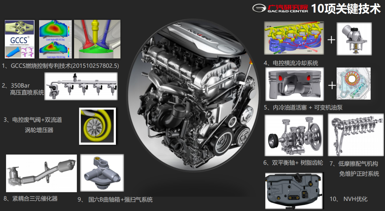 讲完排放,再来聊一聊动力和油耗。发动机压缩比越大,理论上热效率越高,但高压比会带来很多问题,比如常说的爆震。前面已经看过这台发动机的参数,10:1的压缩比不算很高,但以它196N·m的升扭矩来说,就不算低了。问题来了,广汽研究院的发动机工程师想了什么办法降低爆震?
