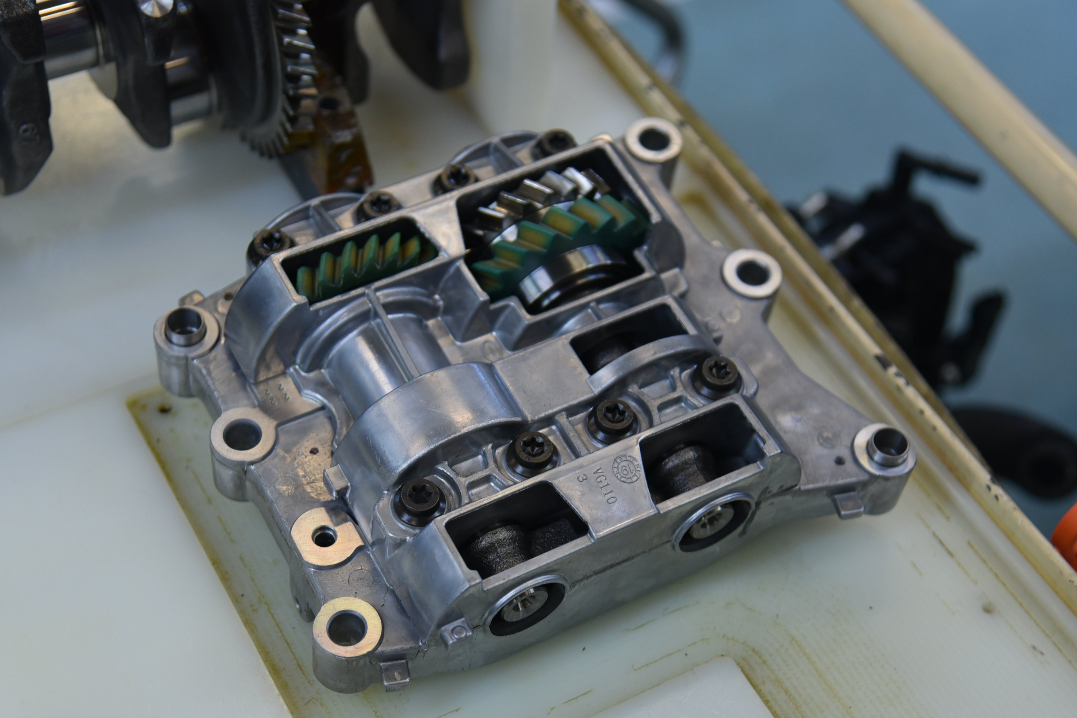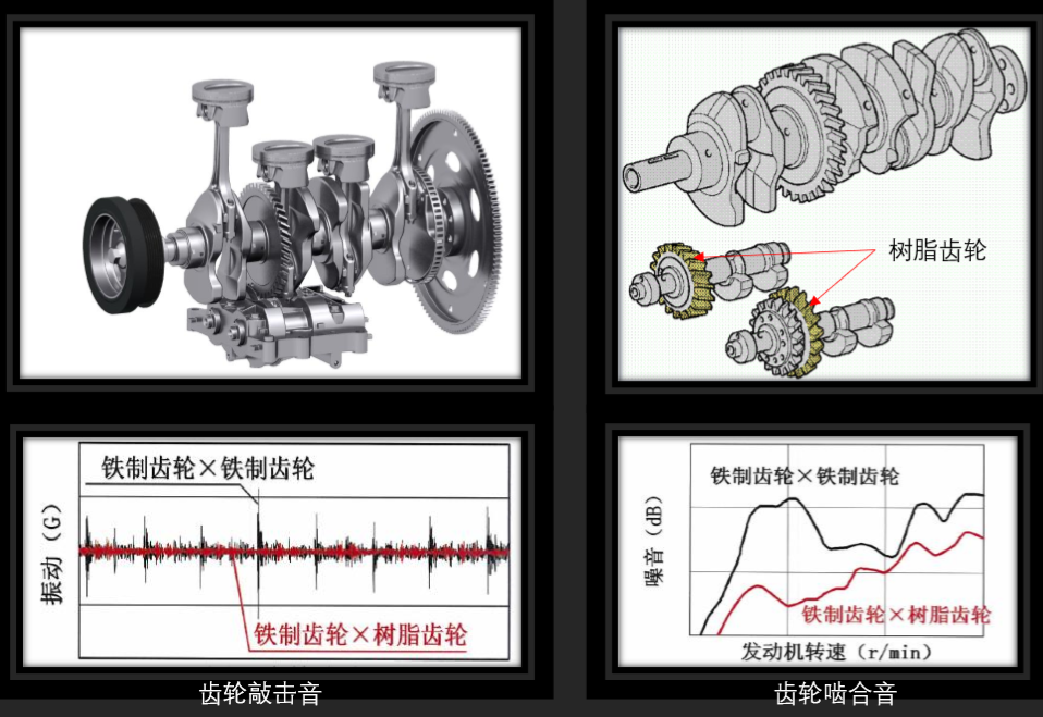 四缸发动机为了抵消二阶震动,会在发动机上加两根平衡轴,平衡轴以曲轴两倍的速度运转。这样带来一个问题,平衡轴与曲轴齿轮高速运转会产生很大噪音,工程师想了一个办法,将平衡轴的齿轮换成树脂材料。