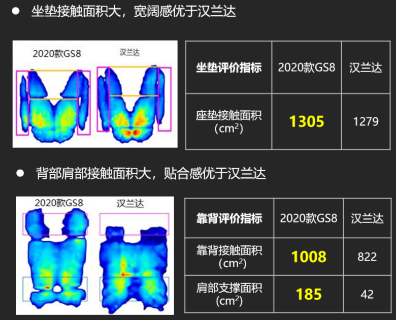 首先我们来谈谈静态体验,这次传祺与中汽研进行了技术合作,拿到很多人体工程学数据,于是将这些数据用于座椅研发。座椅的好坏直接决定舒适性,而座椅舒适性主要体现在身体各部位的承压,如果压力过多集中在一块部位,那坐起来很累。从数据看,2020款GS8座椅接触面积明显大于汉兰达。