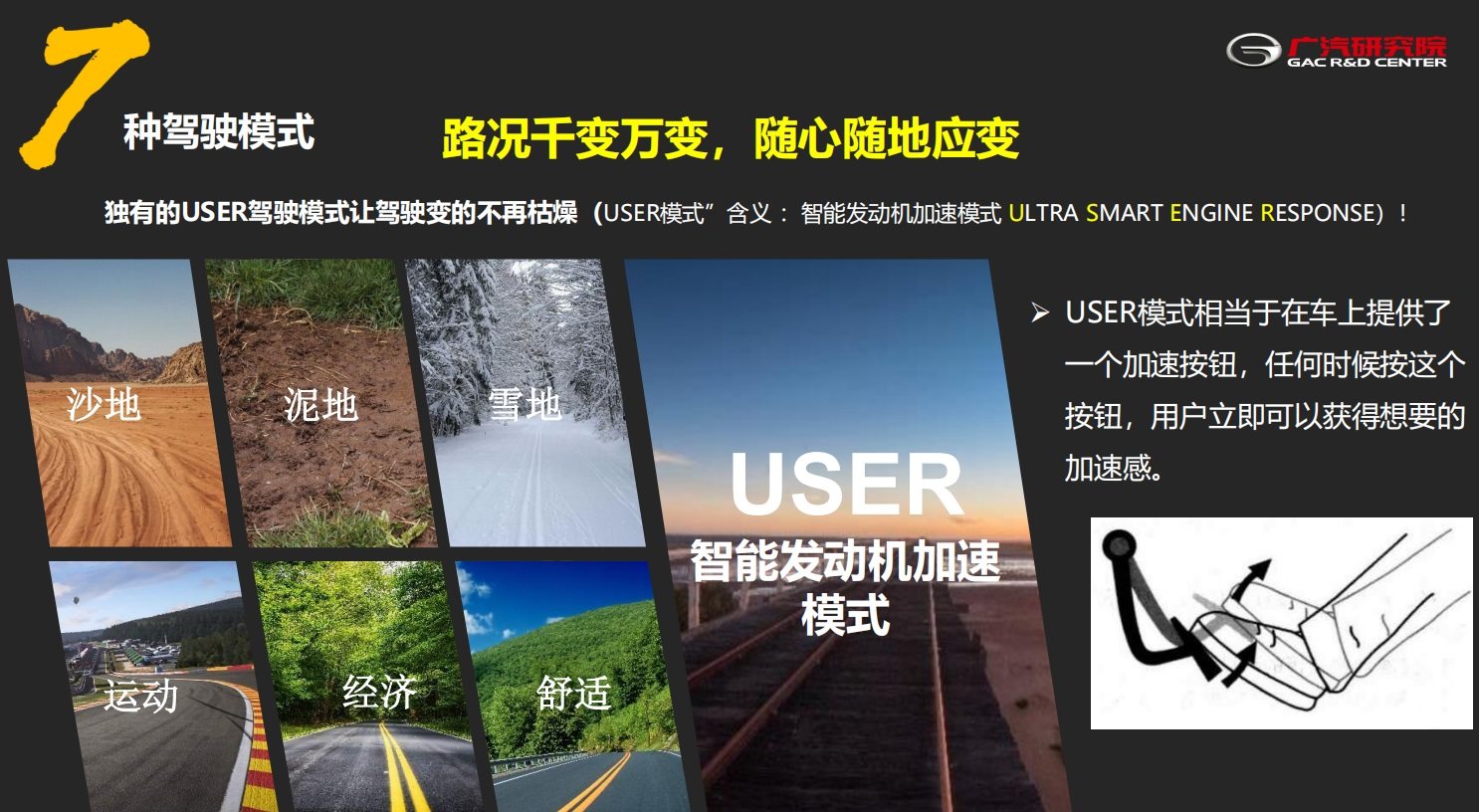 中期改款的GS8动力匹配花了很多心思,工程师不断优化EMS和TCU,并且开发了一个User模式,这个模式分为7挡,当使用1挡时,这台爆发力不错的2.0T,居然能开出1.6L自吸家用车的感觉,而切换到7挡时,又像打了鸡血,稍微给油就有明显加速感。在动力匹配方面,GS8已经达到了很高的水准,场地测试主观上好于汉兰达。