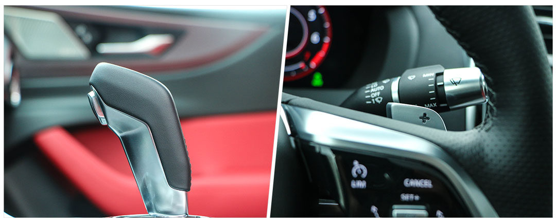 座椅材质采用豪华温莎皮革,座椅偏硬但包裹性不错,更低矮的坐姿加上加大号的换挡拨片,就很有驾驶热情。