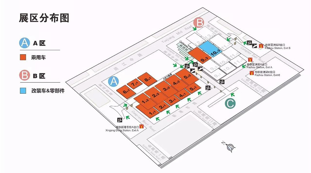 本届广州车展在场馆上与往年一样设有A、B两个区,共有15个展馆。其中,B区的9.3展馆为豪车馆,10.3展馆为改装车及零部件展出区域。