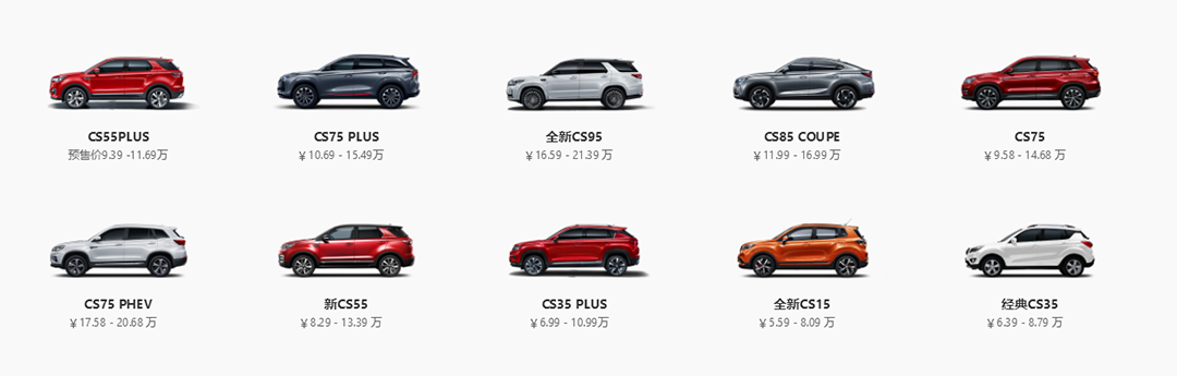 随后长安开始广泛布局产品,睿骋、CS15/CS55/CS75/CS85/CS95等车型相继问世,长安欧尚、长安轻型车、长安跨越等品牌多款车型在市场上大面积铺开,这一时期的长安产品数量非常多,各个细分市场基本被覆盖齐全了,这一时期叫做大产品时代。