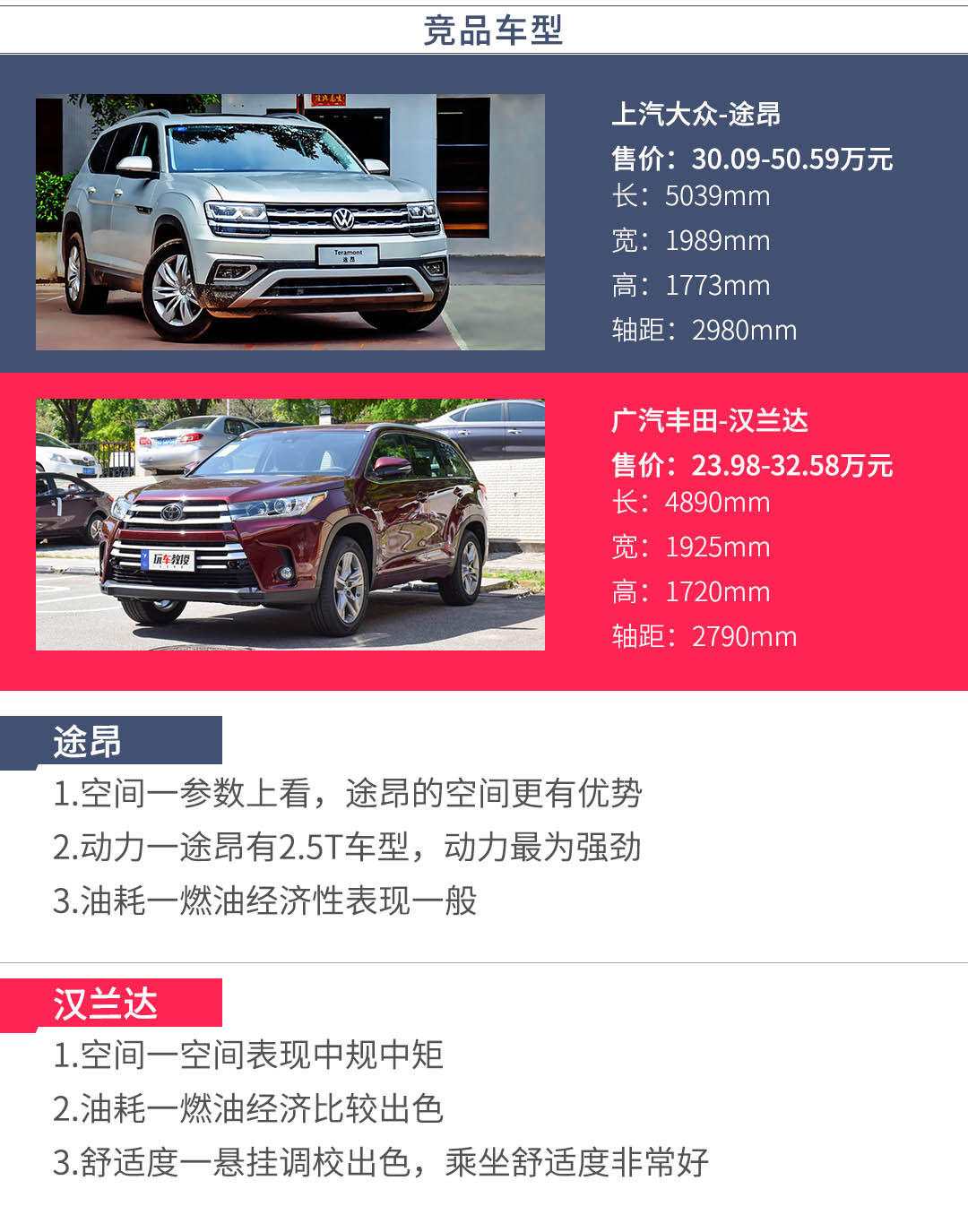 既然是七座SUV,当然要与现在市场上比较火热的两款车型进行个比较,它们分别是大众的途昂和丰田的汉兰达。
