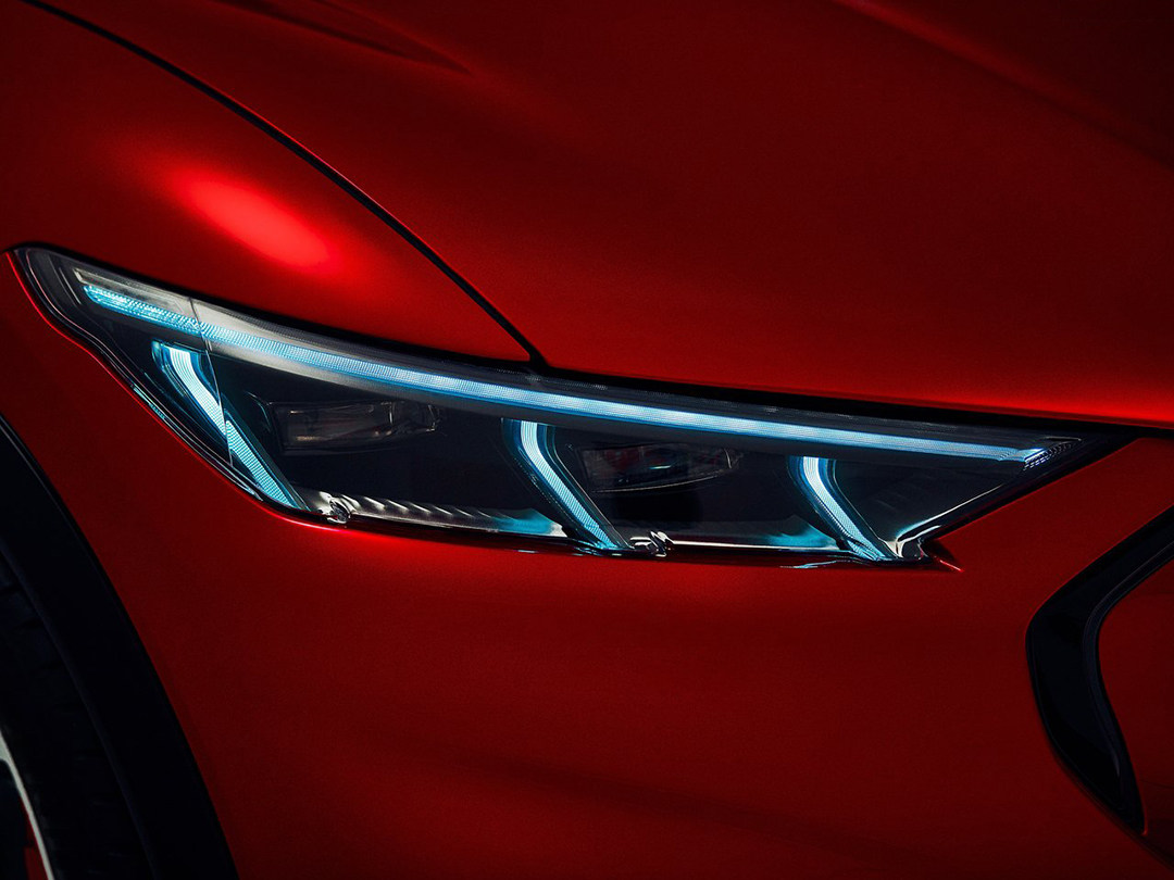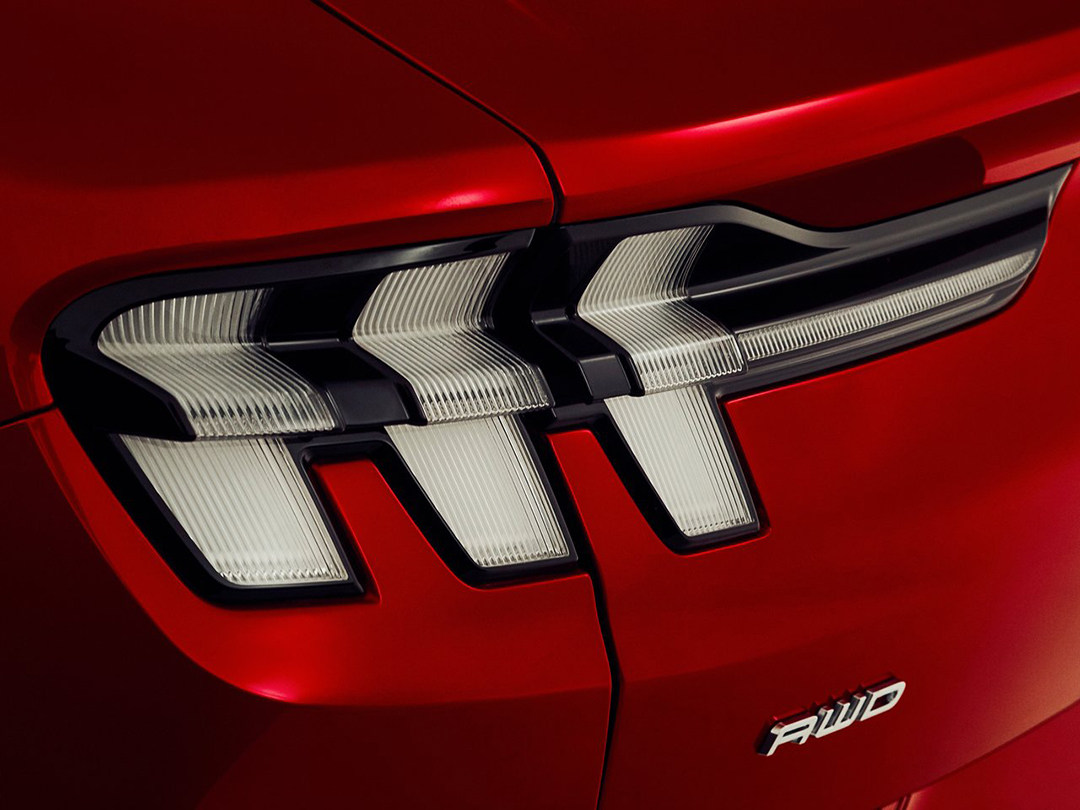 MUSTANG Mach-E延续了过去经典的设计元素,凶狠的大灯更加狭长且扁平化,三条竖状的LED日行灯被依次排列,并扩充至整个灯腔内部,直接勾勒出眼神的犀利感。全封闭式的前格栅不再需要进气,面积被放大,3D打印的车标替代了传统立体标的设计,并在格栅轮廓边缘使用黑色饰条凸显其运动感,整个前脸让人既熟悉,但又有新花样的体现。