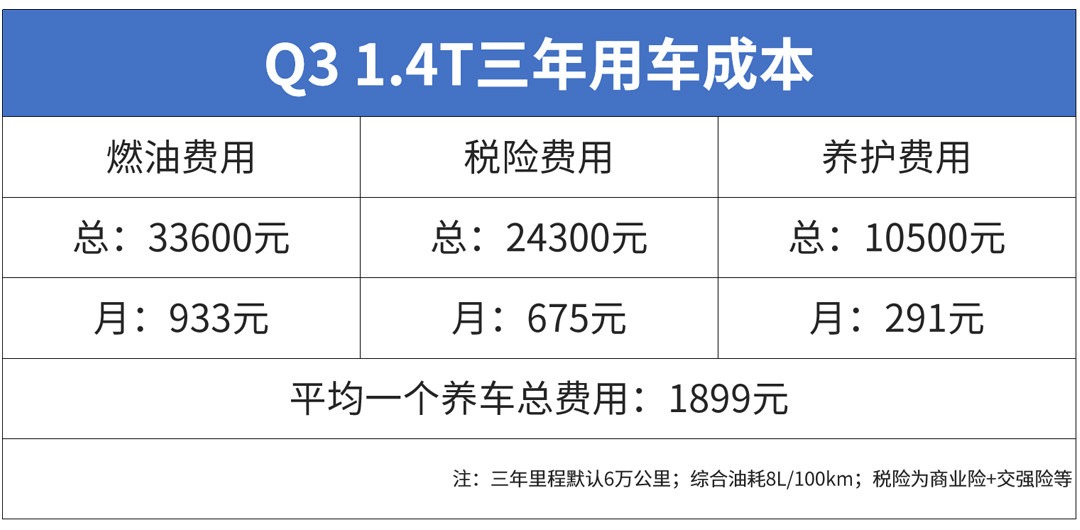 以下养车费用都是以入门车型为主,默认三年行驶里程为6万公里,大家可以看到奥迪Q3平均月养车费用在1900元左右,2.0T车型会突破2000元。这样的花费也就比普通的B级车多那么300-500元,看来豪车的后期养护也没有这么贵嘛。