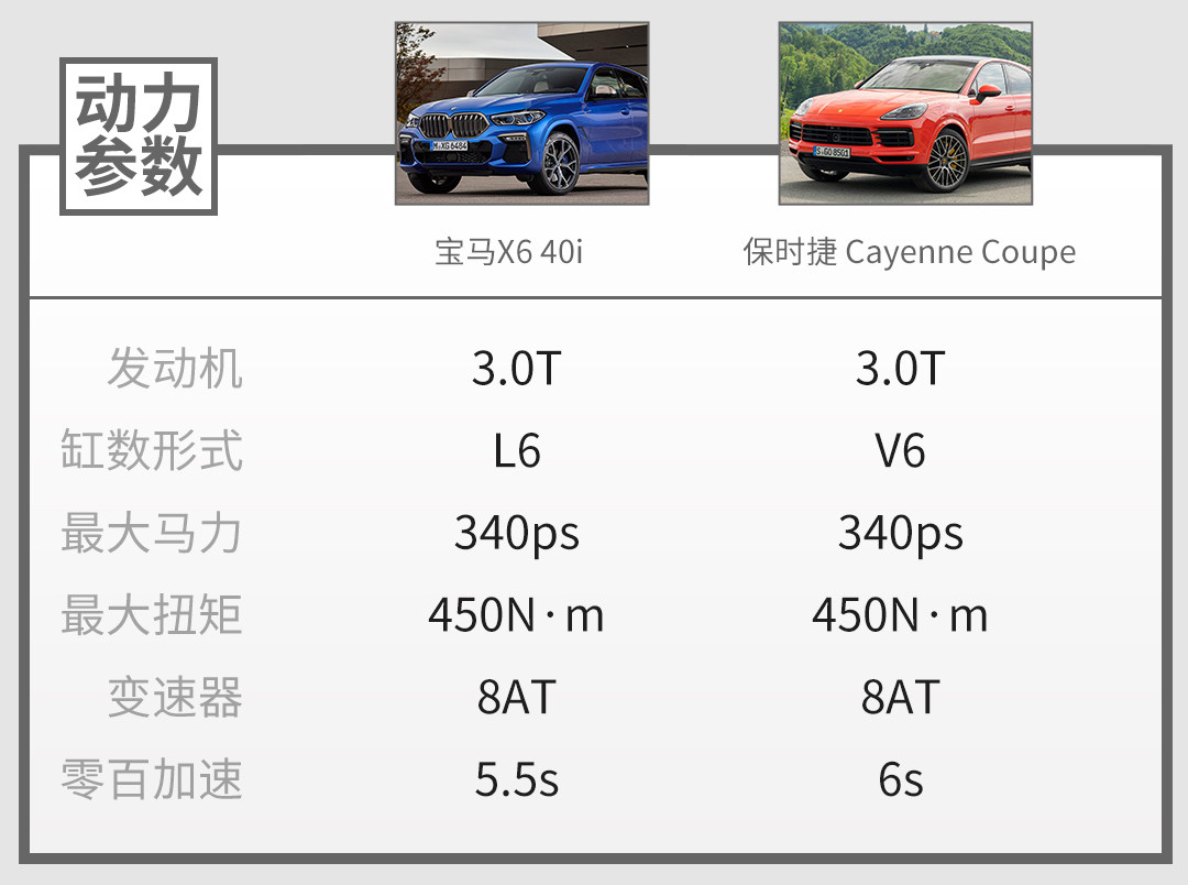 跟卡宴Coupe同价位的X6 xDrive 40i,同样拥有340匹马力,450牛·米最大扭矩,峰值扭矩比卡宴Coupe来得晚一些,但在采埃孚 8AT变速箱的助力下,X6 40i的百公里加速时间只需5.5秒,实测可能会更快,因为宝马的官方数据经常“撒谎”。