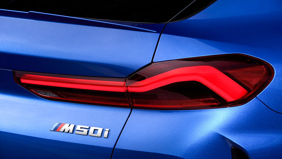 来到最精髓的尾部,这一代X6的溜背比以往更修直,但保留有一定的弧度,过了A柱就开始下坠,整个尾部收紧,从正面稍稍侧一点就能看到尾部的姿态,尾灯相当有科技感。