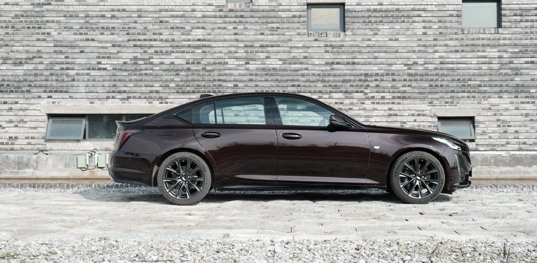 侧面是最能体现凯迪拉克CT5之美的部分,长车头,短前悬,长后悬的设计让整车极具动感。由于凯迪拉克CT5是原版设计,前后车门的比例前长后短,所以很难看出,这是一台4米9长的中型车。