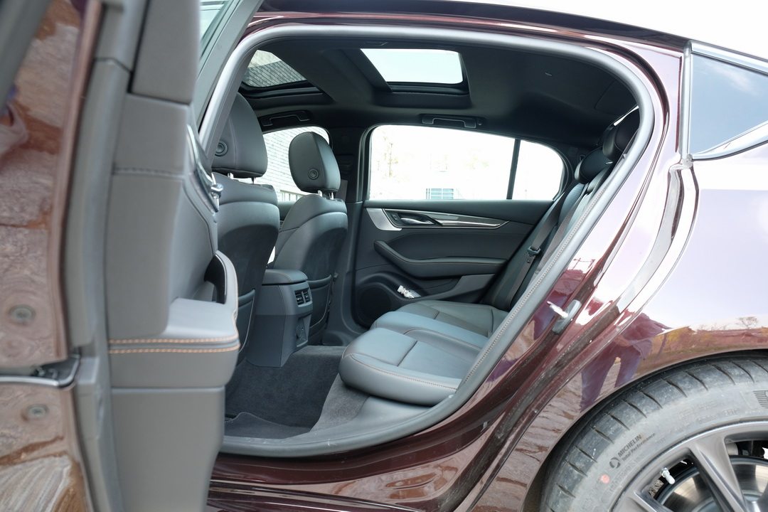 这台4米9的中型车,它后排的乘坐空间其实跟加长后的3系相差无几。以笔者1米73的身高坐进去,凯迪拉克CT5后排的腿部空间约为3拳,而头部空间所剩无几。照理来说,4米9的车身不应只有这么多空间。其实,凯迪拉克为了不破坏车身比例感而去加长,所以,CT5的乘坐空间看上去就跟车身长度不成比例。