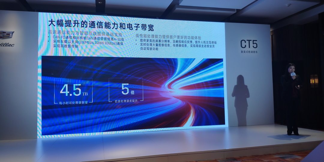 内饰设计等等并不是CT5的重点。真正的重点是,凯迪拉克最新一代的电子系统率先搭载在凯迪拉克CT5身上。这套新的电子系统拥有每小时4.5TB数据的处理量,是目前市面上主流电子系统的5倍。
