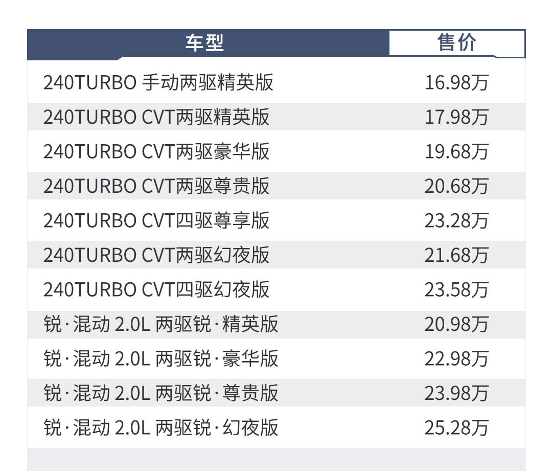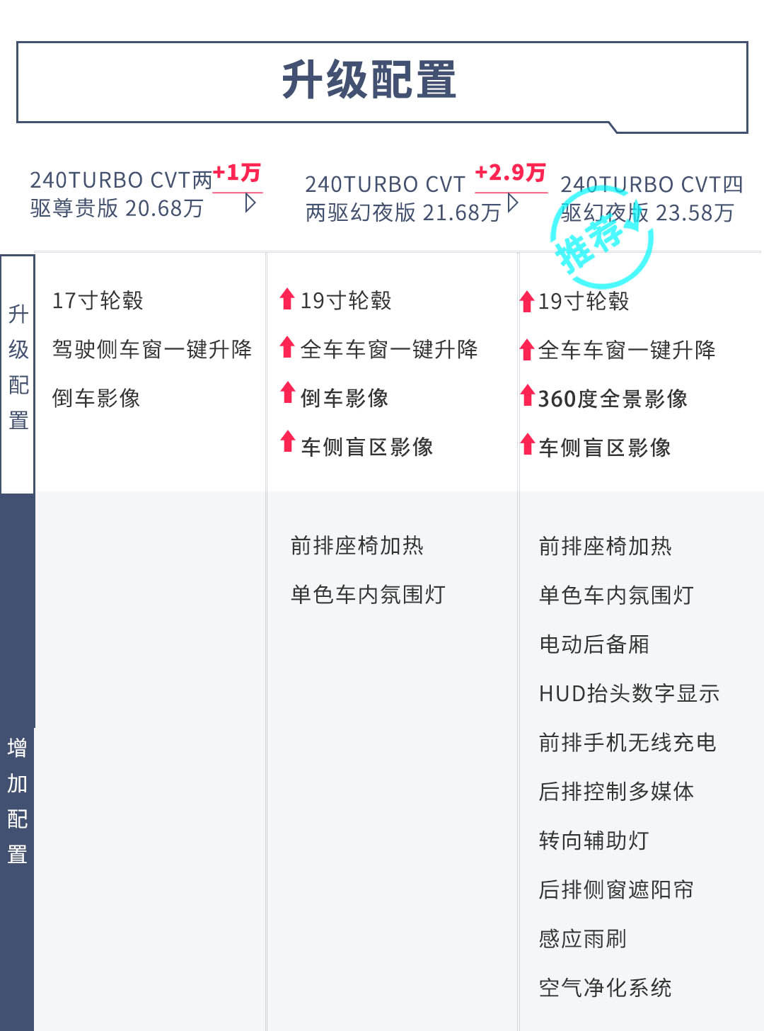 在11款车型中,1.5T动力共有5款两驱车型和2款四驱车型,2.0L混动的4款车型均为两驱版本,而大家比较关心的幻夜版共有三款车型,分别为1.5T两驱、1.5T四驱和2.0L混动版本。在这11款车型中究竟如何选,不妨先看下全系有哪些标配。