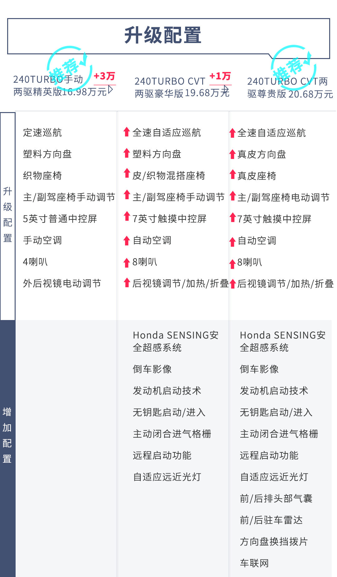 豪华型的价格比精英型贵了3/2(手动/自动)万块,主要升级自动空调,增加了Honda SENSING安全超感系统,无钥匙进入和启动功能,配置虽然变化不少,但还不够吸引力。因为方向盘仍然为塑料的,座椅依旧是手动调节,并且没有配备第二代Honda CONNECT智导互联系统。既然已经花了19.68万元,为什么不一步到位,再加一万元,购买20.68万的尊贵版,那么舒适性配置就要高一截。