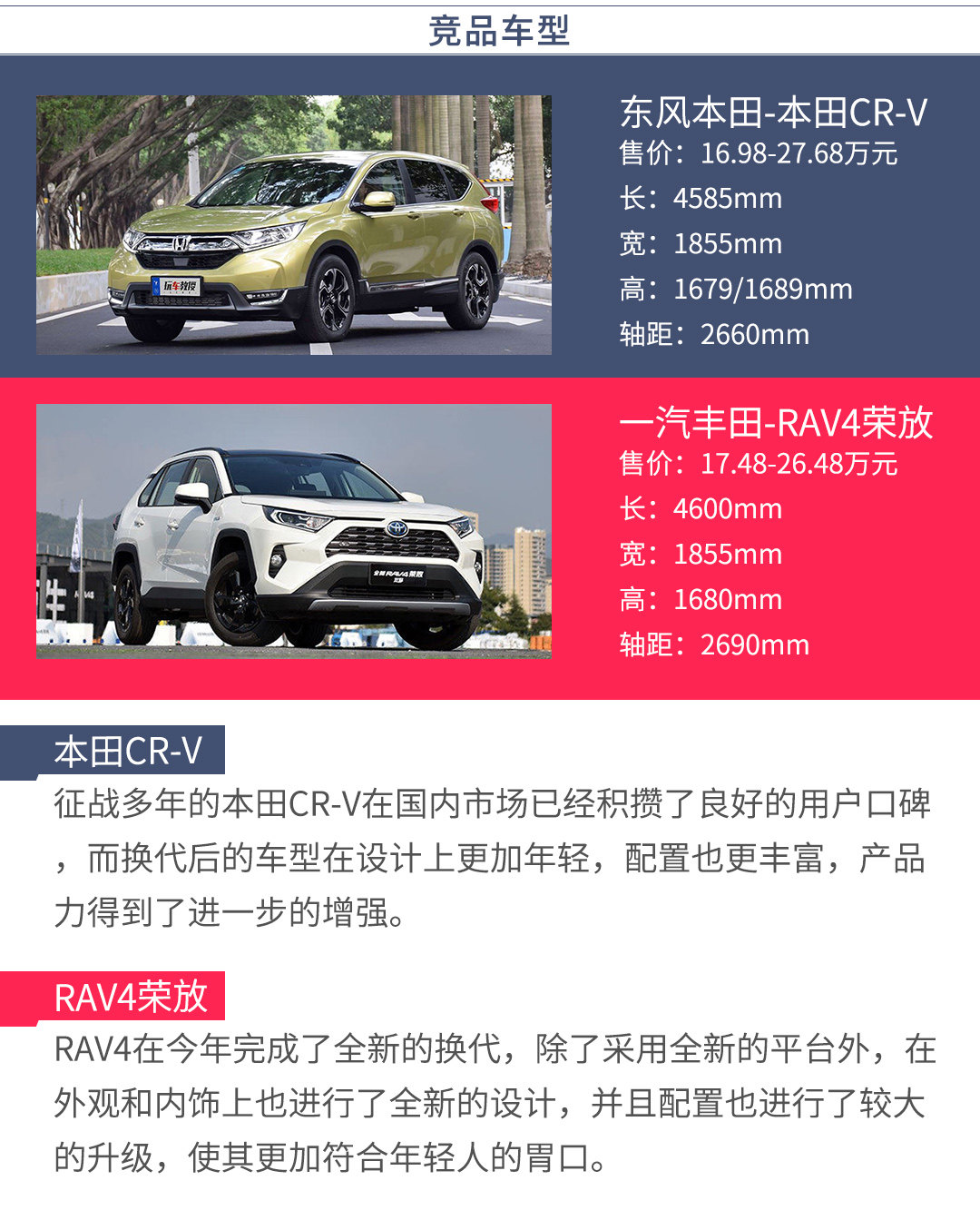 从外观来看,全新RAV4和皓影都是更加倾向年轻消费者的车型。RAV4在安全配置上会更加丰富,全系标配7个安全气囊和丰田TSS2.0智行安全技术系统,而皓影在中高配车型上才配备了Honda SENSING安全超感系统。不过动力上,皓影1.5T燃油版要强于2.0L RAV4,另外皓影还提供了更加张扬的幻夜版车型。